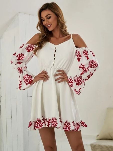 Gorgeous Red & white cold shoulder ruffle hem dress